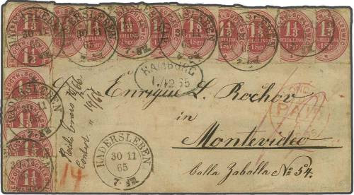Old German States Schleswig-Holstein 1865, inscribed “HERZOGTH. SCHLESWIG” 1 ? schilling rose, 15 copies, affixed overlapping, all tied by several clear strikes “HADERSLEBEN 30 11 65” and partly by oval transit mark of Hamburg to envelope via London (red “PAID” marking on front) to Montevideo, Uruguay; on front red “½” showing paid 2 d. British transit and 1 sh. Sea Postage; the franking partly small faults, where affixed at the edge of the cover and one adhesive fixed around the edge of the cover; a phantastic entire, the only known complete letter to South America and largest multiple franking of this stamp; certificate van der Linden BPP and opinion Maria Brettl.