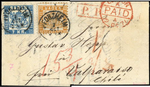 Altdeutschland Baden 1862, 7 Kr. blau und 30 Kr. orangegelb auf PP-Brief mit K1 “Pforzheim 7 Oct” nach Valparaiso in Chile, waagerecht geglätteter Bug durch beide Marke und drei Marken wurden vom Brief entfernt, sign. Metzger und Unverfehrt, Fotoattest Brettl BPP “sehr seltene Mischfrankatur und Destination”