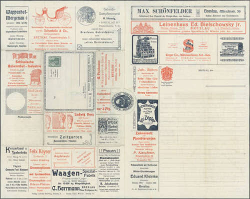 1910 (ca.), Dt. Reich. Privat-Anzeigen-Faltbrief 5 Pf Germania Breslau Serie I mit vielen tollen illustrierten Anzeigen (= Motive). Dabei sind Wagenfabrik (Rollwagen), Bildnisse (Frau im Medaillon), Englische Drehrollen (Maschine), Automobil-Centrale (Auto), Solinger Stahlwaren (Schere), Pfefferminzküchel (Dose Franz. Sobtzick), Mineralbrunnen (Flasche), Sattlermeister (Kutschenpferd), Foto: Breslauer Rathaus, Möbeltransport (Möbelwagen), Kofferfabrik (Mann stapelt Koffer), Zahnatelier (Frau mit Zahnschmerzen), Plattfuss-Stiefel (Füsse), Rohrmöbel (Korbsessel), Wagenbau (Kutsche), Malzkaffe (Frau mit Tasse), Getreide-Dampfbrennerei (Fabrikszene), Singer-Nähmaschinen (Logo), Leinenhaus (Logo) sowie weiter viele Textanzeigen, u.a. für Menstruationspulver, Grammophone, Waagen bis 10 Tonnen etc. Ungebraucht. Sehr gute Erhaltung!